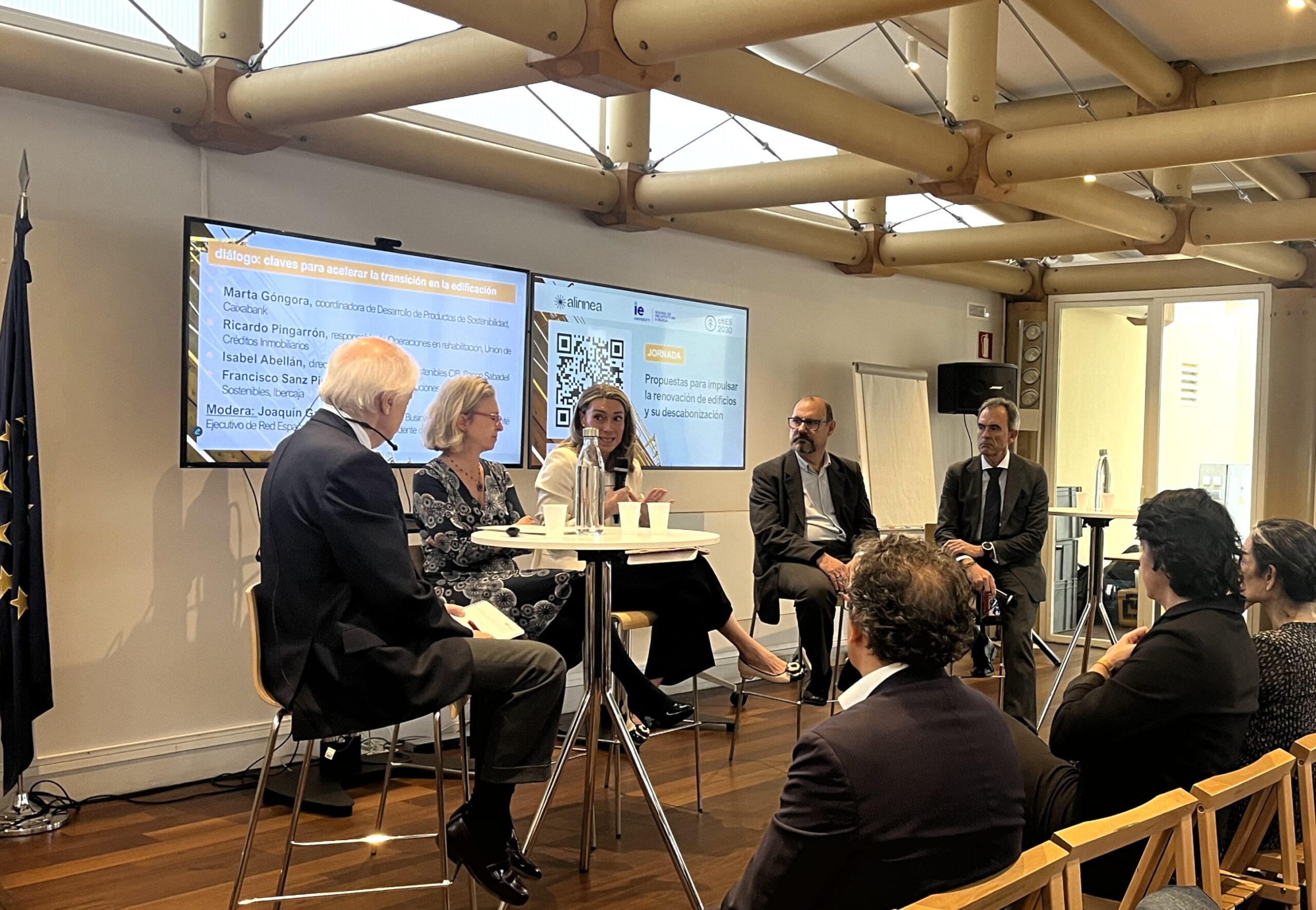 The first roundtable brought together key representatives from the financial sector, a central player in the report’s call to action. Participants included Marta Góngora, Sustainability Product Development Coordinator at CaixaBank; Ricardo Pingarrón, Head of Rehabilitation Operations at Unión de Créditos Inmobiliarios (UCI); Isabel Abellán, Director of ESG and Sustainable Finance CIB at Banco Sabadell; and Francisco Sanz Piedrafita, Director of Sustainable Finance Solutions at Ibercaja. The session was moderated by Joaquín Garralda, professor at IE Business School, member of the Executive Committee of the Spanish Global Compact Network, and former president of Spainsif.
