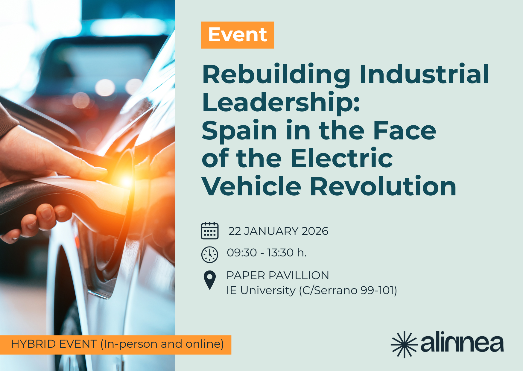 This event aims to analyse the current state of the automotive industry with regard to electric vehicles, focusing on the concrete and viable proposals that emerged from the working group “Facing the Future: The Challenge of the Electric Automotive Sector”, promoted by alinnea in 2025.